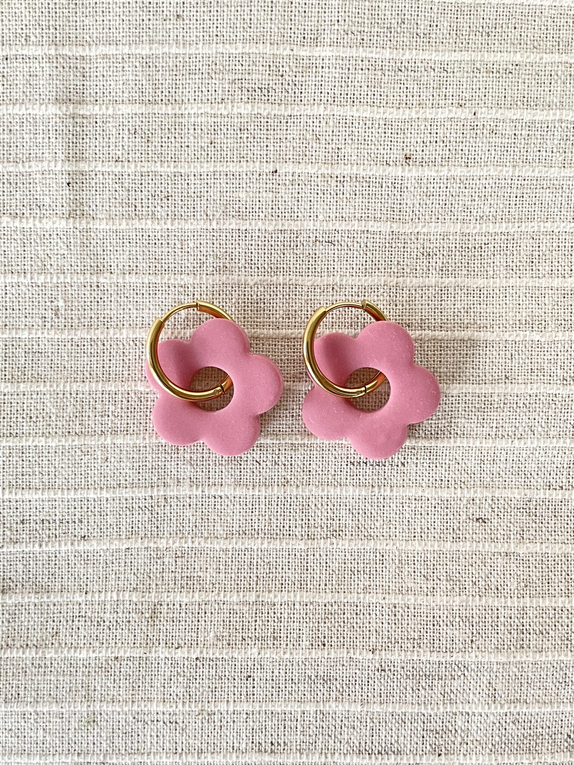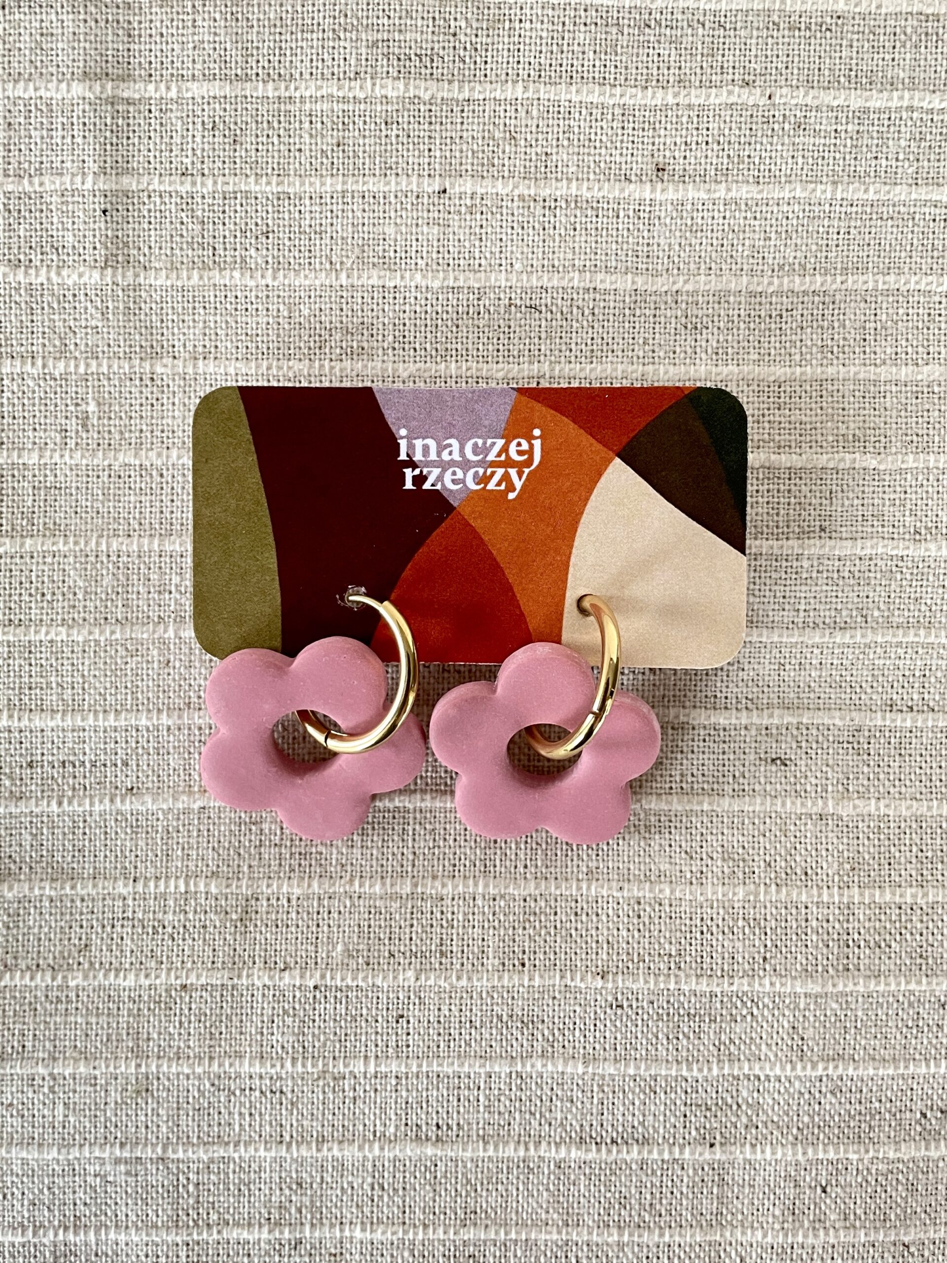 Złote koła ze stali chirurgicznej z matowym kwiatem z gliny polimerowej w odcieniu różu. Minimalistyczne i uniwersalne, pasujące do codziennych i eleganckich stylizacji.