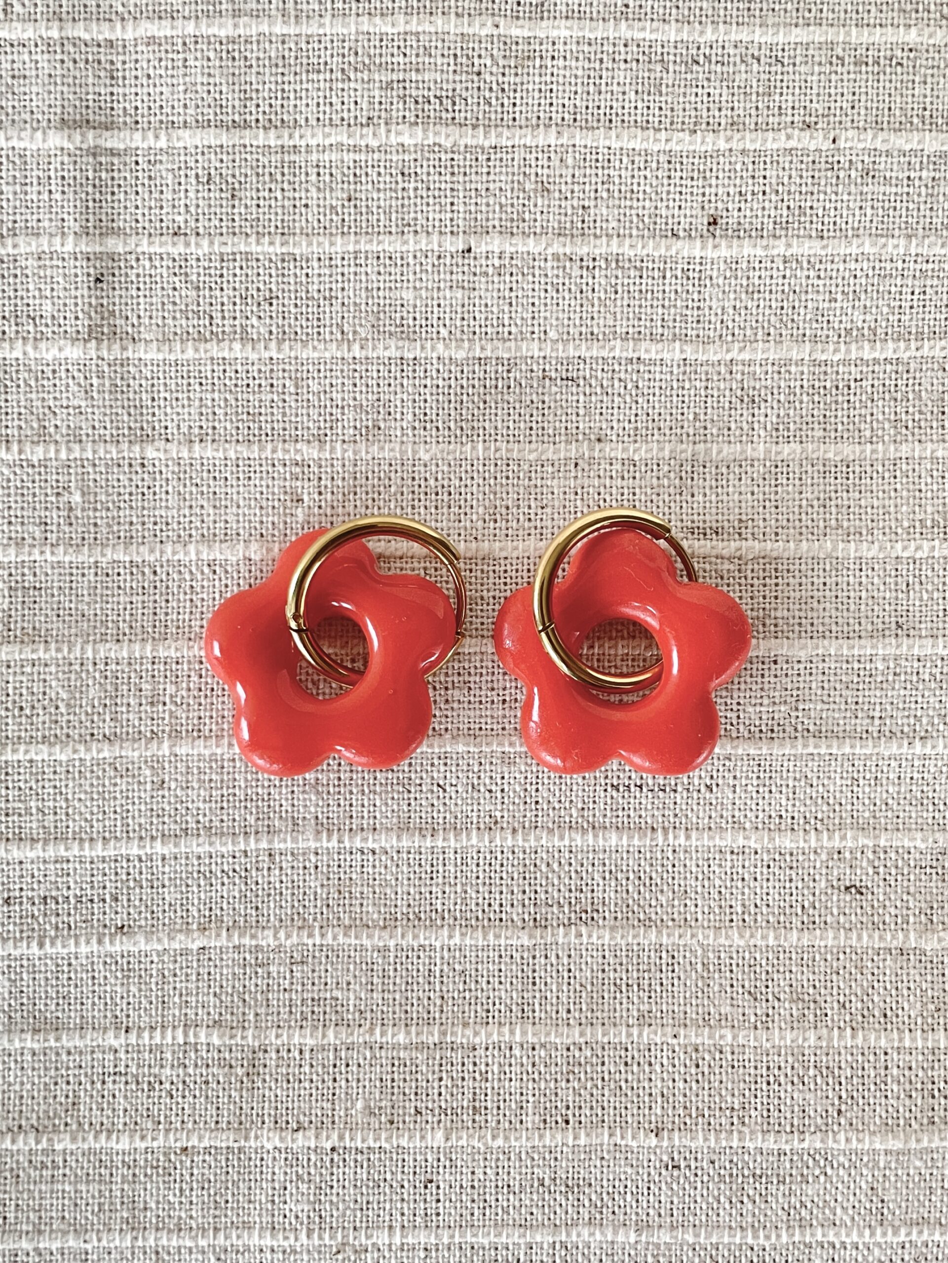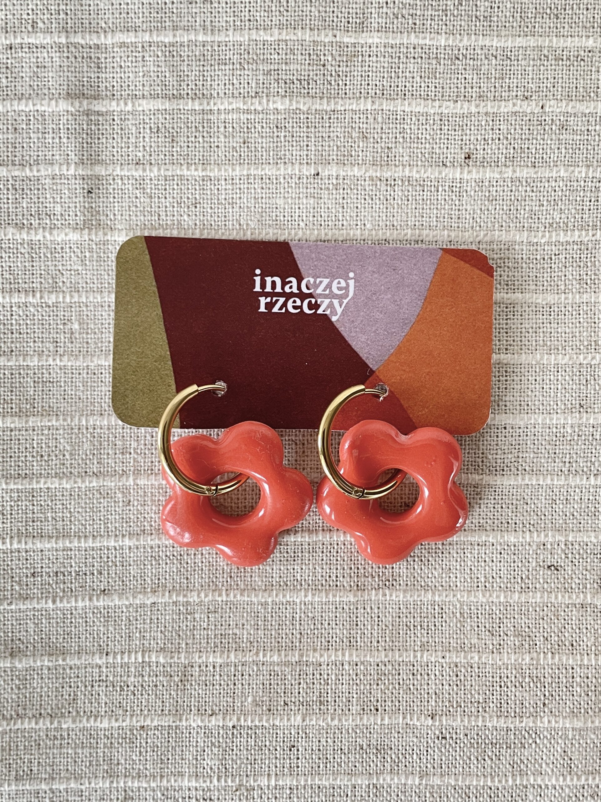 Złote koła ze stali chirurgicznej połączone kwiatem z gliny polimerowej. Kwiat ma błyszcące wykończenie i zwracający uwagę kolor. Całość jest radosna ale uniwersalna, łatwa do noszenia na co dzień, ale pozwoli Ci też błyszczeć w wyjątkowych sytuacjach.
